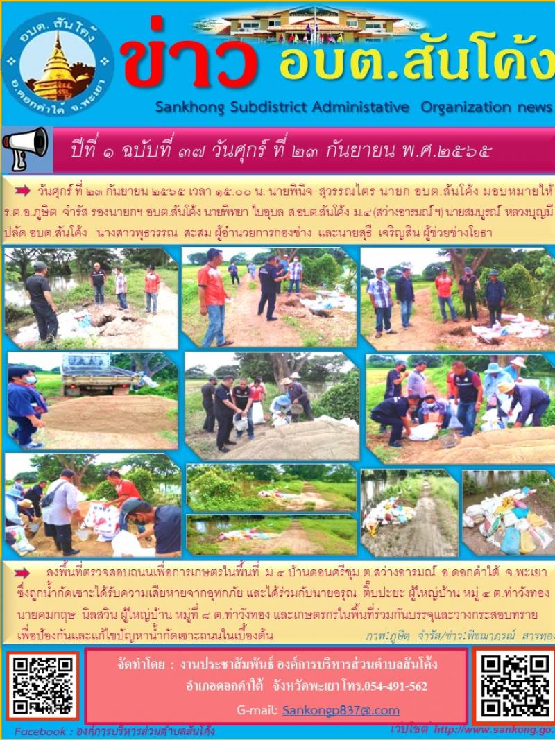 description วันศุกร์ ที่ ๒๓ กันยายน ๒๕๖๕ เวลา ๑๕.๐๐ น. นายพินิจ สุวรรณไตร นายก อบต.สันโค้ง มอบหมายให้ ร.ต.อ.ภูษิต จำรัส รองนายกฯ อบต.สันโค้ง พร้อมกับนายพิทยา ใบอุบล ส.อบต.สันโค้ง ม.๔ (สว่างอารมณ์ฯ) นายสมบูรณ์ หลวงบุญมี ปลัด อบต.สันโค้ง นางสาวพุธวรรณ สะสม ผู้อำนวยการกองช่าง และนายสุธี เจริญสิน ผู้ช่วยนายช่างโยธา ลงพื้นที่ตรวจสอบถนนเพื่อการเกษตร หมู่ที่ ๔ ต.สว่างอารมณ์ อ.ดอกคำใต้ จ.พะเยา ซึ่งถูกน้ำกัดเซาะได้รับความเสียหายจากอุทกภัยและได้ร่วมกับนายอรุณ ติ๊บปะยะ ผู้ใหญ่บ้าน หมู่ที่ ๔ ต.ท่าวังทอง นายคมกฤษ นิลสวิน ผู้ใหญ่บ้าน หมู่ที่ ๘ ต.ท่าวังทอง และเกษตรกรในพื้นที่ร่วมกันบรรจุและวางกระสอบทราย เพื่อป้องกันและแก้ไขปัญหาน้ำกัดเซาะถนนในเบื้องต้น person admin