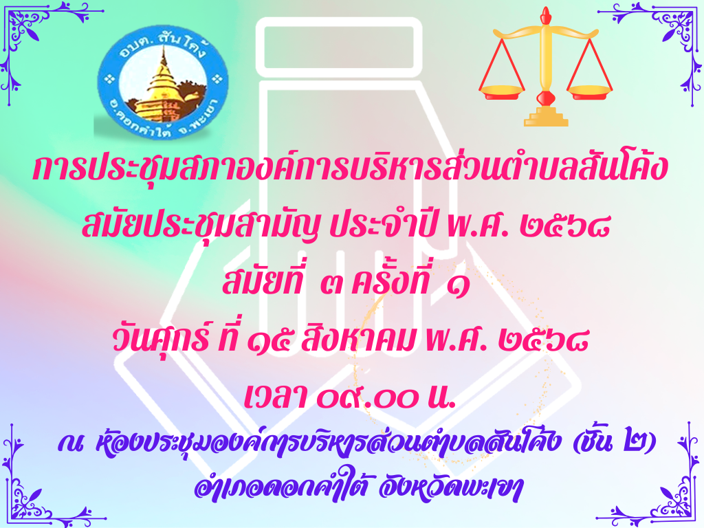 ประชุมสภาองค์การบริหารส่วนตำบลสันโค้ง สมัยประชุมสามัญ ประจำปี พ.ศ. ๒๕๖๘ สมัยที่ ๓ ครั้งที่ ๑ ณ ห้องประชุม อบต.สันโค้ง (ชั้น ๒) อ.ดอกคำใต้ จ.พะเยา