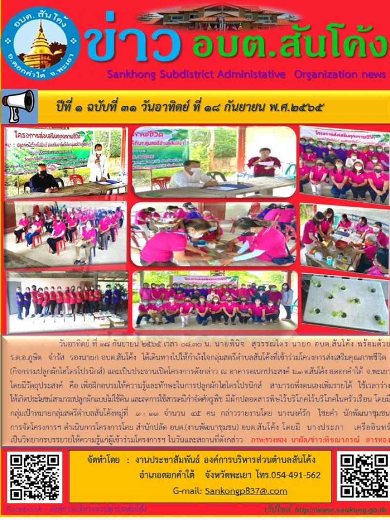 description วันอาทิตย์ ที่ ๑๘ กันยายน ๒๕๖๕ เวลา ๐๘.๓๐ น. นายพินิจ สุวรรณไตร เป็นประธานเปิดโครงการโครงการส่งเสริมคุณภาพชีวิต(กิจกรรมปลูกผักไฮโดรโปรนิกส์) พร้อมด้วย ร.ต.อ.ภูษิต จำรัส รองนายก อบต.สันโค้ง ณ อาคารอเนกประสงค์ ม.๑ ต.สันโค้ง อ.ดอกคำใต้ จ.พะเยา โดยมี นางนงค์รัก ไชยคำ นักพัฒนาชุมชน กล่าวรายงานการจัดโครงการฯ โดยมีวัตถุประสงค์เพื่อฝึกอบรมให้ความรู้และทักษะในการปลูกผักไฮโดรโปรนิกส์ สามารถพึ่งตนเองเพิ่มรายได้ ใช้เวลาว่างให้เกิดประโยชน์สามารถปลูกผักแบบไม่ใช้ดิน และเพื่อลดการใช้สารเคมีกำจัดศัตรูพืช มีผักปลอดสารพิษไว้บริโภคไว้บริโภคในครัวเรือน โดยมีกลุ่มเป้าหมายกลุ่มสตรีตำบลสันโค้งหมู่ที่ ๑ – ๑๑ จำนวน ๔๕ คน โดยได้รับการสนับสนุนวิทยากร โดย นางประภา เครืออินทร์ มาบรรยายให้ความรู้แก่ผู้เข้าร่วมโครงการในวันและสถานที่ดังกล่าว person admin