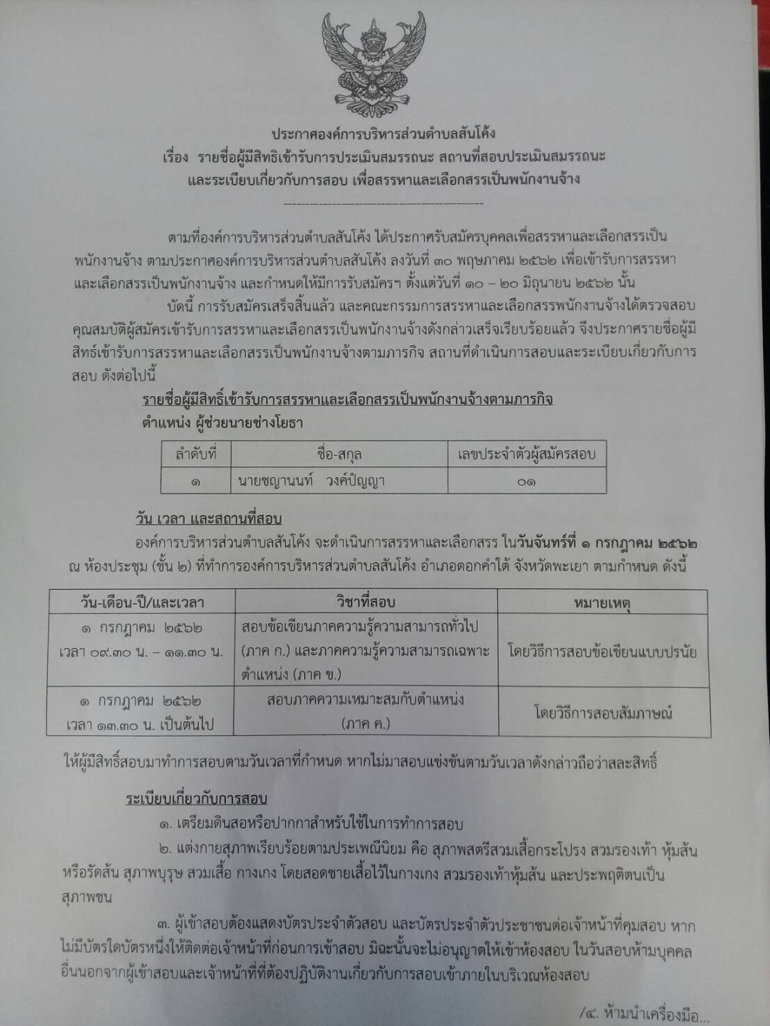 ประกาศรายชื่อผู้มีสิทธิเข้ารับการประเมินสมรรถนะ สถานที่สอบประเมินสมรรถนะ และระเบียบเกี่ยวกับการสอบ เพื่อสรรหาและเลือกสรรเป็นพนักงานจ้าง