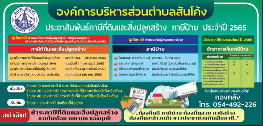 องค์การบริหารส่วนตำบลสันโค้ง ประชาสัมพันธ์ภาษีที่ดินและสิ่งปลูกสร้าง ภาษีป้าย ประจำปี 2565