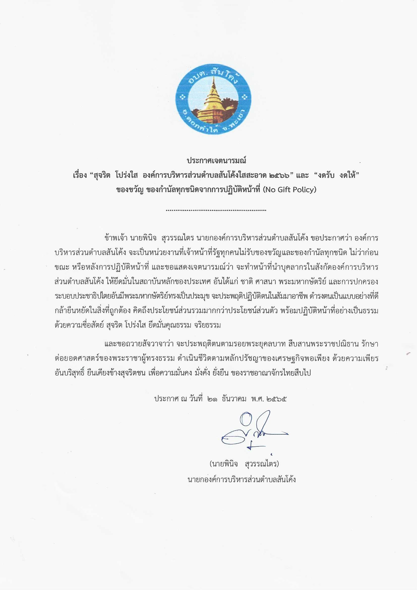 ประกาศเจตนารมณ์ เรื่่อง "สุจริต โปร่งใส องค์การบริหารส่วนตำบลสันโค้ง ใสสะอาด ๒๕๖๖" และ "งดรับ งดให้" ของขวัญของกำนัลทุกชนิดจากการปฏิบัิหน้าที่ (No Gift Policy)