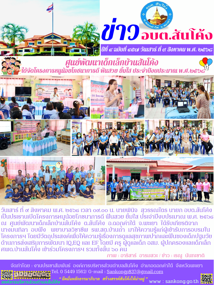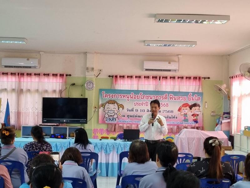 รายละเอียด : วันเสาร์ ที่ ๙ สิงหาคม พ.ศ. ๒๕๖๘ เวลา ๐๙.๐๐ น. นายพินิจ สุวรรณไตร นายก อบต.สันโค้ง เป็นประธานเปิดโครงการหนูน้อยโภชนาการดี ฟันสวย ยิ้มใส ประจำปีงบประมาณ พ.ศ. ๒๕๖๘ ศูนย์พัฒนาเด็กเล็กบ้านสันโค้ง ต.สันโค้ง อ.ดอกคำใต้ จ.พะเยา ได้รับเกียรติจาก นางมนทิลา อบฟ้ง พยาบาลวิชาชีพ รพ.สต.บ้านถ้ำ มาให้ความรู้แก่ผู้เข้ารับการอบรมใน โครงการฯ โดยมีวัตถุประสงค์เพื่อให้ความรู้เรื่องการดูแลสุขภาพปากและฟันของเด็กปฐมวัย ด้านการส่งเสริมการพัฒนา IQ,EQ และ EF โดยมี ครู ผู้ดูแลเด็ก อสม. ผู้ปกครองและเด็กเล็ก ศพด.บ้านสันโค้้ง เข้าร่วมโครงการฯ รวมทั้งสิ้น ๖๐ คน ภาพ : อาริสาร์ อารมสวะ / ข่าว : เรณู นันทะชาติ