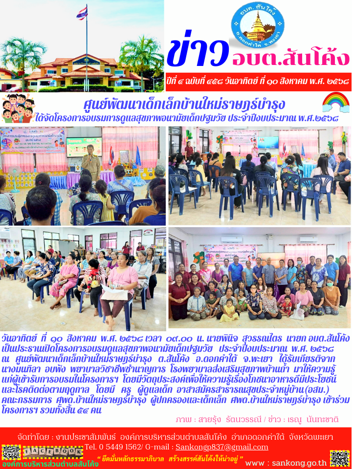 โครงการอบรมดูแลสุขภาพอนามัยเด็กปฐมวัย ประจำปีงบประมาณ พ.ศ. ๒๕๖๘ ณ ศูนย์พัฒนาเด็กเล็กบ้านใหม่ราษฎร์บำรุง ต.สันโค้ง อ.ดอกคำใต้ จ.พะเยา [10 สิงหาคม 2568]