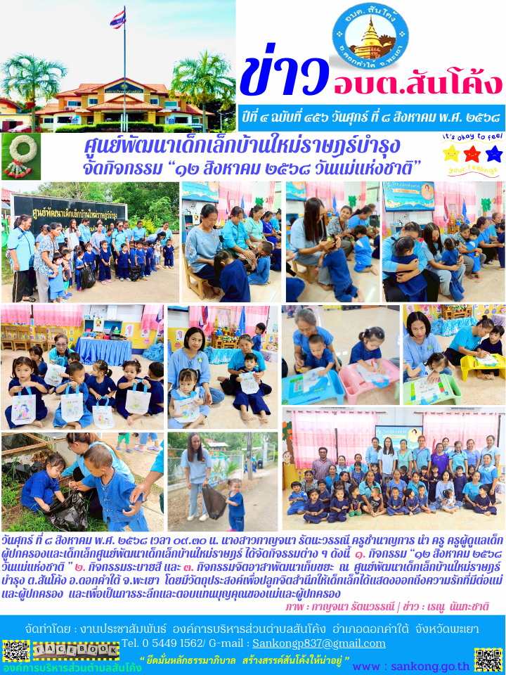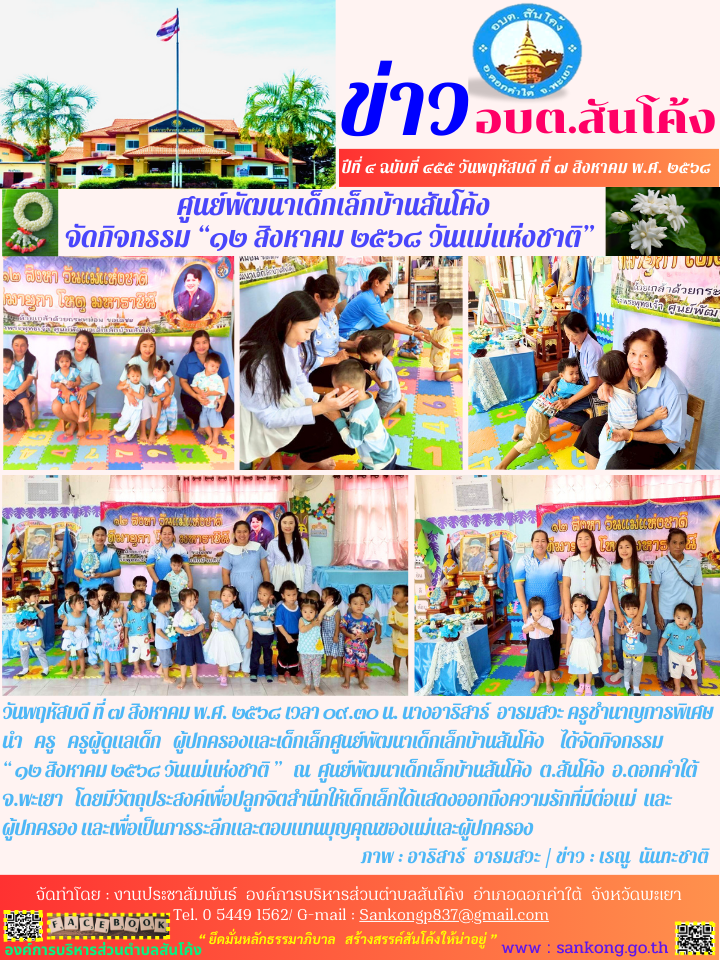 ศูนย์พัฒนาเด็กเล็กบ้านสันโค้ง ได้จัดกิจกรรม “ ๑๒ สิงหาคม ๒๕๖๘ วันแม่แห่งชาติ ” ณ ศูนย์พัฒนาเด็กเล็กบ้านสันโค้ง ต.สันโค้ง อ.ดอกคำใต้ จ.พะเยา [7 สิงหาคม 2568]