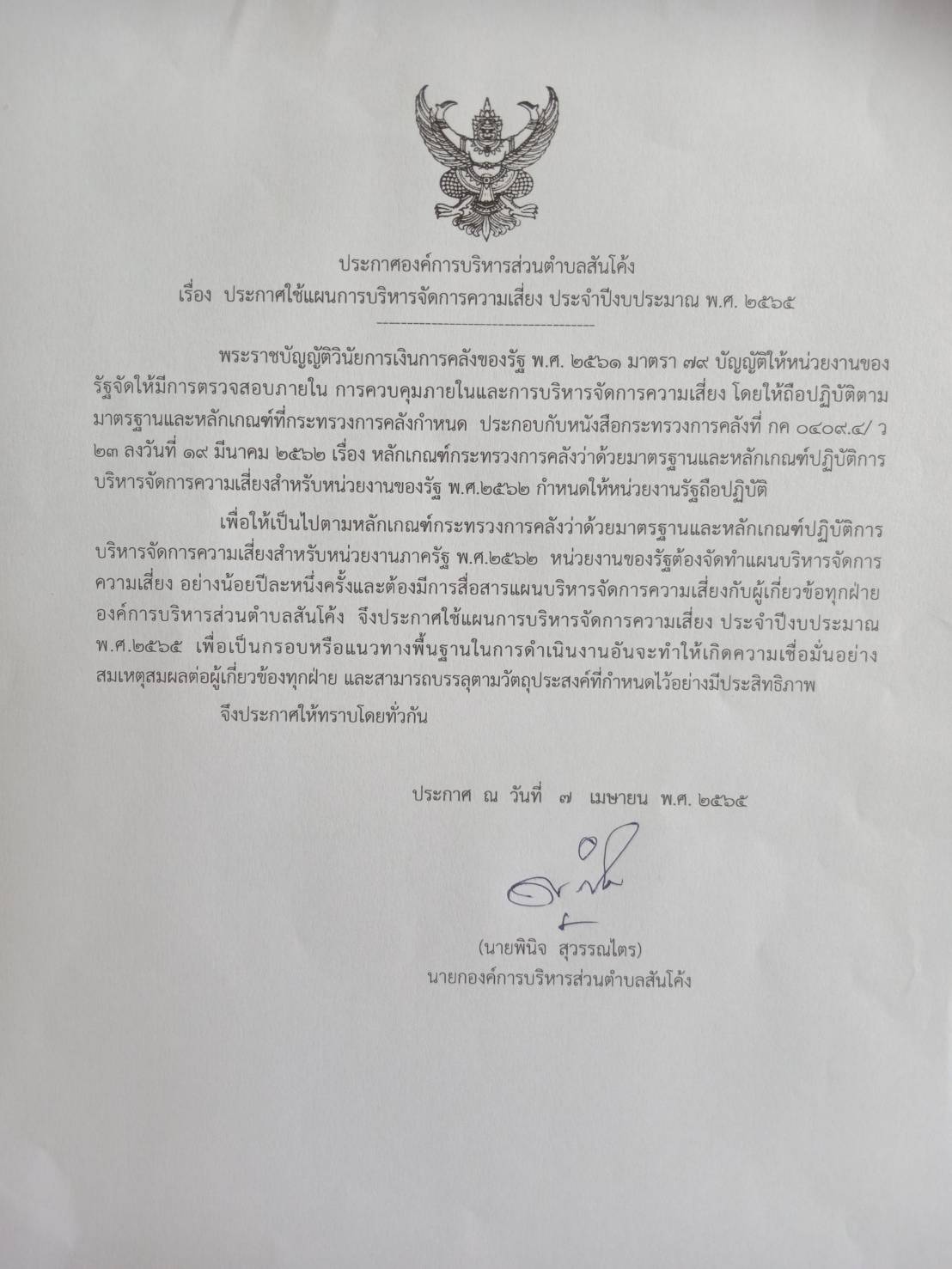 ประกาศใช้แผนการบริหารจัดการความเสี่ยง ประจำปีงบประมาณ พ.ศ 2565